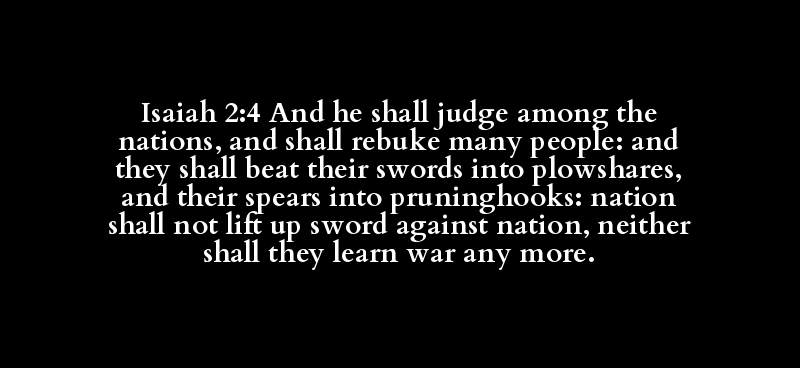 Isaiah 2:4 And he shall judge among the nations, and shall rebuke many people: and they shall beat their swords into plowshares, and their spears into pruninghooks: nation shall not lift up sword against nation, neither shall they learn war any more.