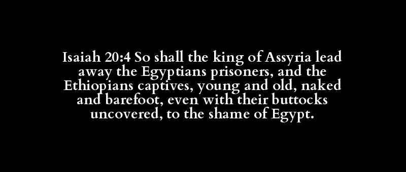 | מֶלֶךְ | אַשּׁוּר | נָהַג | מִצְרַיִם | שְׁבִי | כּוּשׁ | גָּלוּת | נַעַר | זָקֵן | עָרוֹם | יָחֵף | שֵׁתָה | חָשַׂף | עֶרְוָה | מִצְרַיִם |