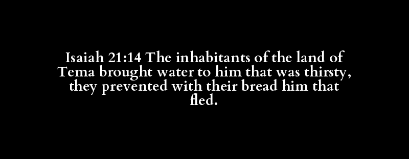 Isaiah 21:14 The inhabitants of the land of Tema brought water to him that was thirsty, they prevented with their bread him that fled.