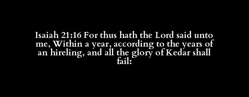 Isaiah 21:16 For thus hath the Lord said unto me, Within a year, according to the years of an hireling, and all the glory of Kedar shall fail: