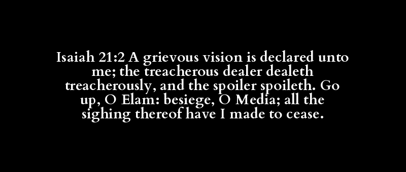 Isaiah 21:2 A grievous vision is declared unto me; the treacherous dealer dealeth treacherously, and the spoiler spoileth. Go up, O Elam: besiege, O Media; all the sighing thereof have I made to cease.