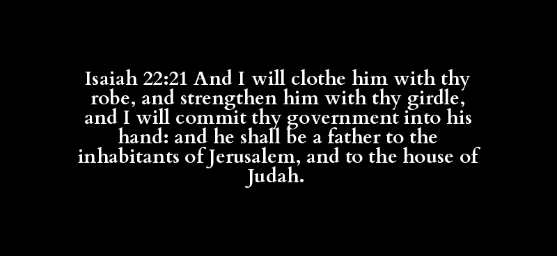 Isaiah 22:21 And I will clothe him with thy robe, and strengthen him with thy girdle, and I will commit thy government into his hand: and he shall be a father to the inhabitants of Jerusalem, and to the house of Judah.
