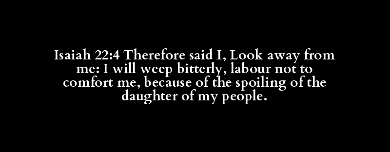 Isaiah 22:4 Therefore said I, Look away from me: I will weep bitterly, labour not to comfort me, because of the spoiling of the daughter of my people.