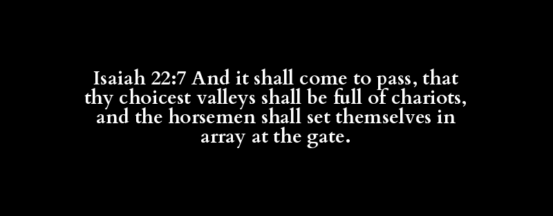 Isaiah 22:7 And it shall come to pass, that thy choicest valleys shall be full of chariots, and the horsemen shall set themselves in array at the gate.