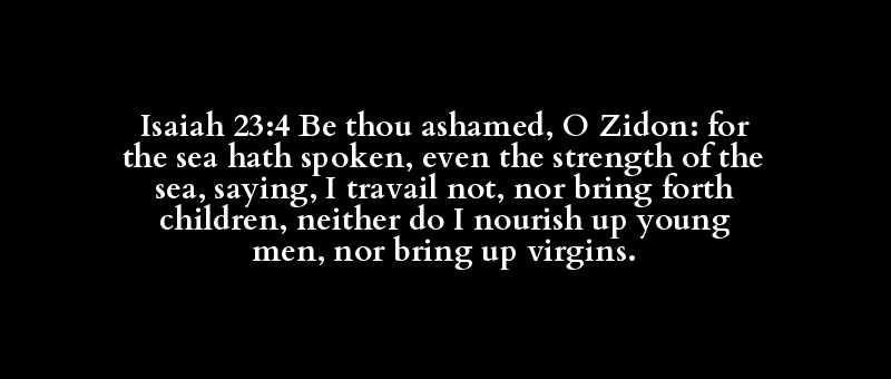 Isaiah 23:4 Be thou ashamed, O Zidon: for the sea hath spoken, even the strength of the sea, saying, I travail not, nor bring forth children, neither do I nourish up young men, nor bring up virgins.