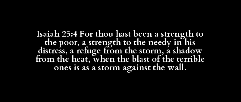 Isaiah 25:4 For thou hast been a strength to the poor, a strength to the needy in his distress, a refuge from the storm, a shadow from the heat, when the blast of the terrible ones is as a storm against the wall.