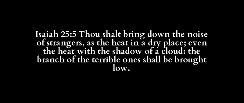 Isaiah 25:5 Thou shalt bring down the noise of strangers, as the heat in a dry place; even the heat with the shadow of a cloud: the branch of the terrible ones shall be brought low.