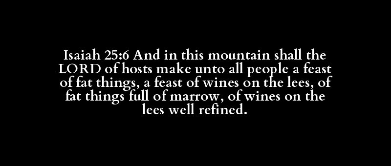 Isaiah 25:6 And in this mountain shall the LORD of hosts make unto all people a feast of fat things, a feast of wines on the lees, of fat things full of marrow, of wines on the lees well refined.
