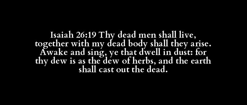Isaiah 26:19 Thy dead men shall live, together with my dead body shall they arise. Awake and sing, ye that dwell in dust: for thy dew is as the dew of herbs, and the earth shall cast out the dead.