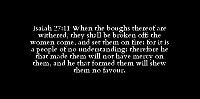 Isaiah 27:11 When the boughs thereof are withered, they shall be broken off: the women come, and set them on fire: for it is a people of no understanding: therefore he that made them will not have mercy on them, and he that formed them will shew them no favour.