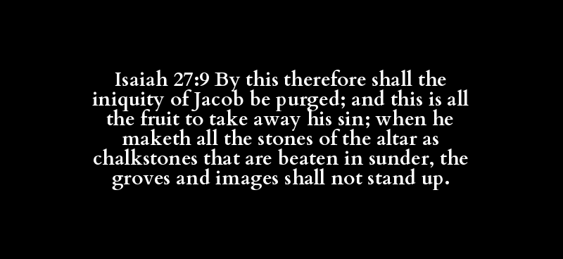 Isaiah 27:9 By this therefore shall the iniquity of Jacob be purged; and this is all the fruit to take away his sin; when he maketh all the stones of the altar as chalkstones that are beaten in sunder, the groves and images shall not stand up.