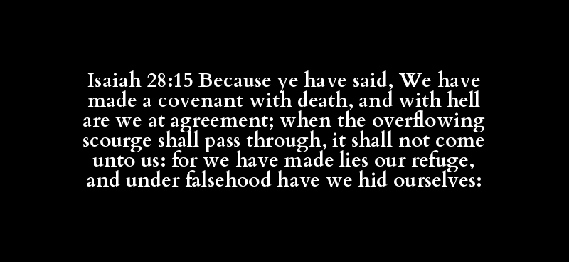 Isaiah 28:15 Because ye have said, We have made a covenant with death, and with hell are we at agreement; when the overflowing scourge shall pass through, it shall not come unto us: for we have made lies our refuge, and under falsehood have we hid ourselves: