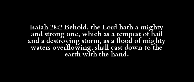 Isaiah 28:2 Behold, the Lord hath a mighty and strong one, which as a tempest of hail and a destroying storm, as a flood of mighty waters overflowing, shall cast down to the earth with the hand.
