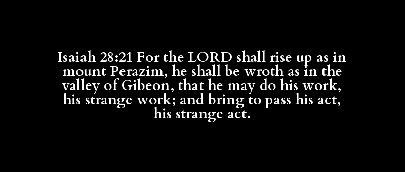 Isaiah 28:21 For the LORD shall rise up as in mount Perazim, he shall be wroth as in the valley of Gibeon, that he may do his work, his strange work; and bring to pass his act, his strange act.
