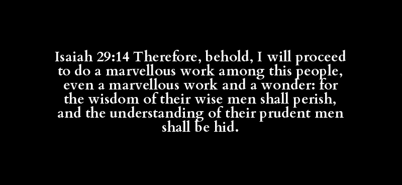 Isaiah 29:14 Therefore, behold, I will proceed to do a marvellous work among this people, even a marvellous work and a wonder: for the wisdom of their wise men shall perish, and the understanding of their prudent men shall be hid.