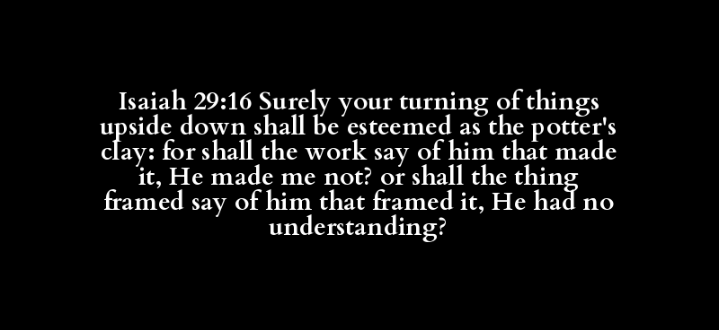 Isaiah 29:16 Surely your turning of things upside down shall be esteemed as the potter's clay: for shall the work say of him that made it, He made me not? or shall the thing framed say of him that framed it, He had no understanding?