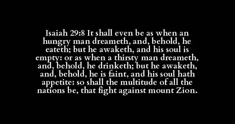 Isaiah 29:8 It shall even be as when an hungry man dreameth, and, behold, he eateth; but he awaketh, and his soul is empty: or as when a thirsty man dreameth, and, behold, he drinketh; but he awaketh, and, behold, he is faint, and his soul hath appetite: so shall the multitude of all the nations be, that fight against mount Zion.
