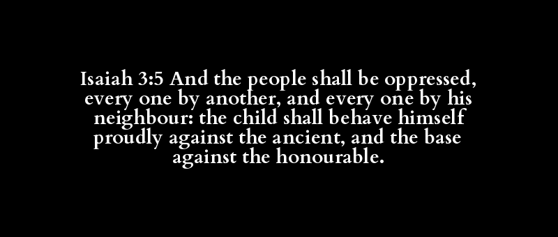 Isaiah 3:5 And the people shall be oppressed, every one by another, and every one by his neighbour: the child shall behave himself proudly against the ancient, and the base against the honourable.