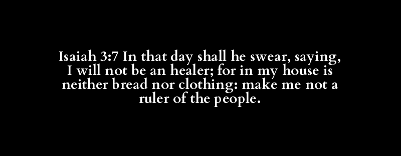 Isaiah 3:7 In that day shall he swear, saying, I will not be an healer; for in my house is neither bread nor clothing: make me not a ruler of the people.