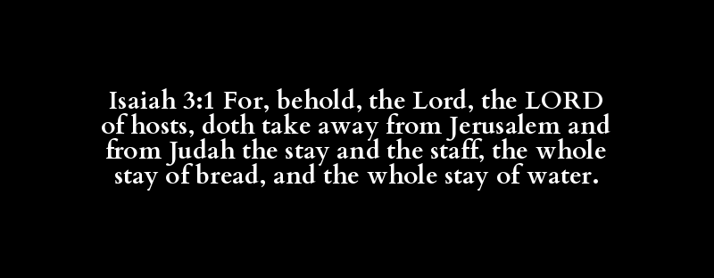 Isaiah 3:1 For, behold, the Lord, the LORD of hosts, doth take away from Jerusalem and from Judah the stay and the staff, the whole stay of bread, and the whole stay of water.
