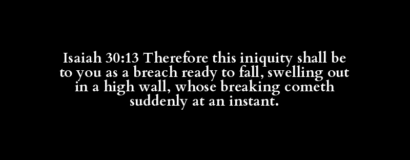 Isaiah 30:13 Therefore this iniquity shall be to you as a breach ready to fall, swelling out in a high wall, whose breaking cometh suddenly at an instant.