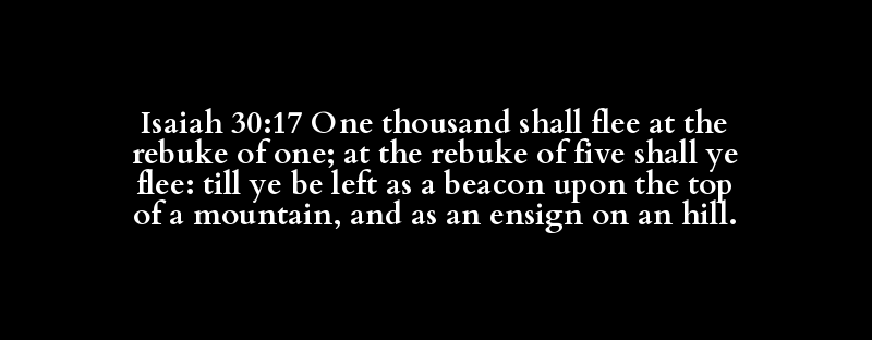 Isaiah 30:17 One thousand shall flee at the rebuke of one; at the rebuke of five shall ye flee: till ye be left as a beacon upon the top of a mountain, and as an ensign on an hill.