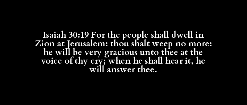 Isaiah 30:19 For the people shall dwell in Zion at Jerusalem: thou shalt weep no more: he will be very gracious unto thee at the voice of thy cry; when he shall hear it, he will answer thee.