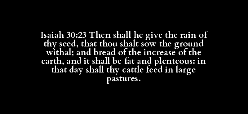 Isaiah 30:23 Then shall he give the rain of thy seed, that thou shalt sow the ground withal; and bread of the increase of the earth, and it shall be fat and plenteous: in that day shall thy cattle feed in large pastures.