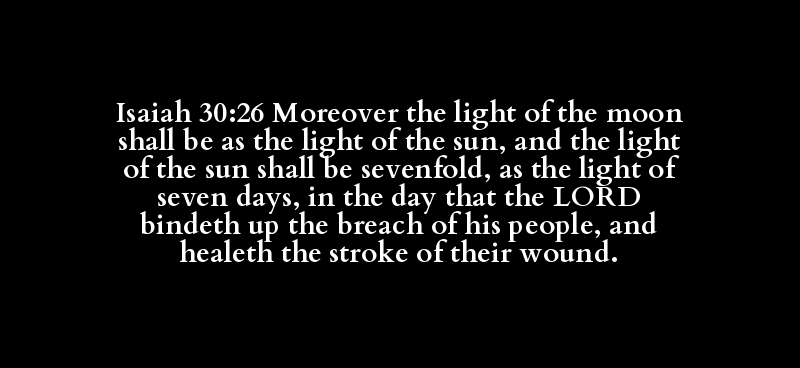 Isaiah 30:26 Moreover the light of the moon shall be as the light of the sun, and the light of the sun shall be sevenfold, as the light of seven days, in the day that the LORD bindeth up the breach of his people, and healeth the stroke of their wound.
