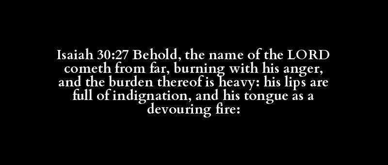 Isaiah 30:27 Behold, the name of the LORD cometh from far, burning with his anger, and the burden thereof is heavy: his lips are full of indignation, and his tongue as a devouring fire: