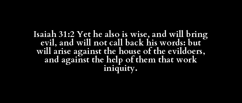 Isaiah 31:2 Yet he also is wise, and will bring evil, and will not call back his words: but will arise against the house of the evildoers, and against the help of them that work iniquity.