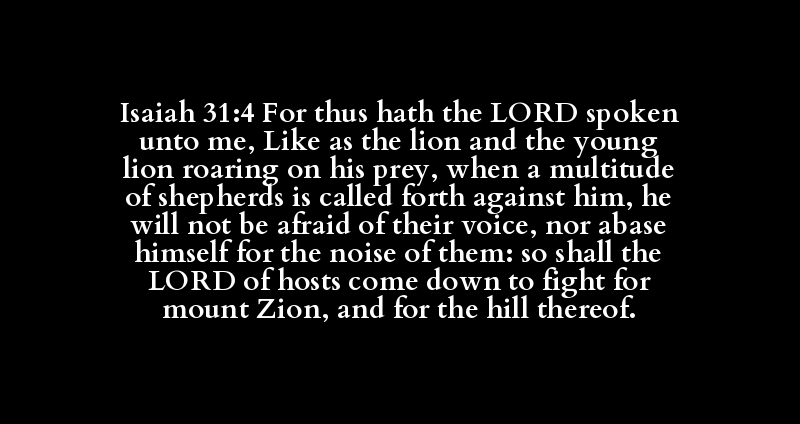 Isaiah 31:4 For thus hath the LORD spoken unto me, Like as the lion and the young lion roaring on his prey, when a multitude of shepherds is called forth against him, he will not be afraid of their voice, nor abase himself for the noise of them: so shall the LORD of hosts come down to fight for mount Zion, and for the hill thereof.