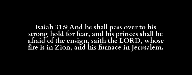 Isaiah 31:9 And he shall pass over to his strong hold for fear, and his princes shall be afraid of the ensign, saith the LORD, whose fire is in Zion, and his furnace in Jerusalem.