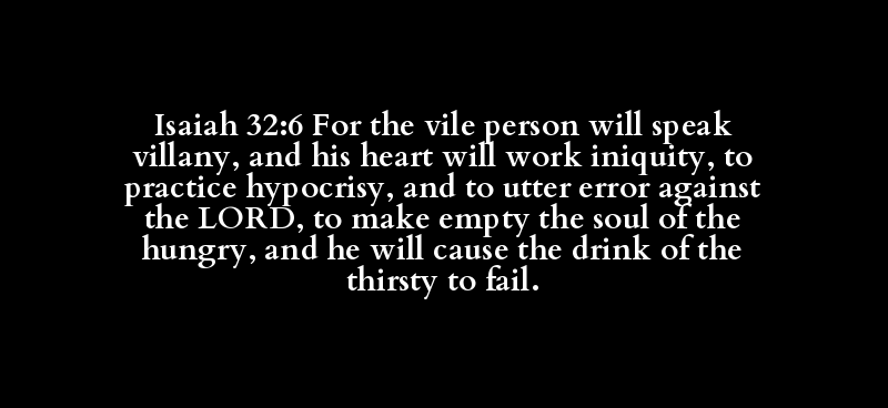 Isaiah 32:6 For the vile person will speak villany, and his heart will work iniquity, to practice hypocrisy, and to utter error against the LORD, to make empty the soul of the hungry, and he will cause the drink of the thirsty to fail.