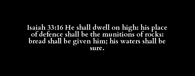 Isaiah 33:16 He shall dwell on high: his place of defence shall be the munitions of rocks: bread shall be given him; his waters shall be sure.
