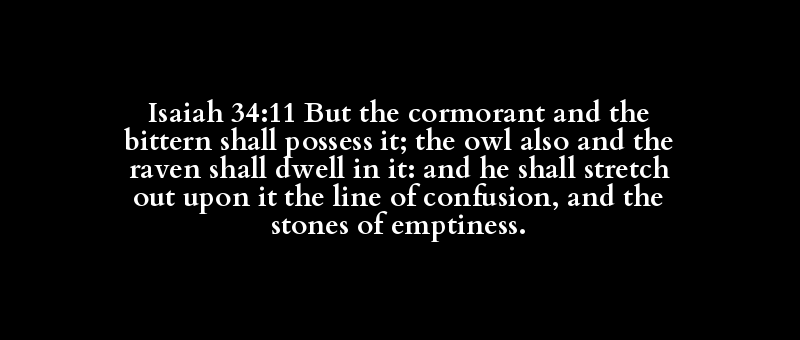 Isaiah 34:11 But the cormorant and the bittern shall possess it; the owl also and the raven shall dwell in it: and he shall stretch out upon it the line of confusion, and the stones of emptiness.