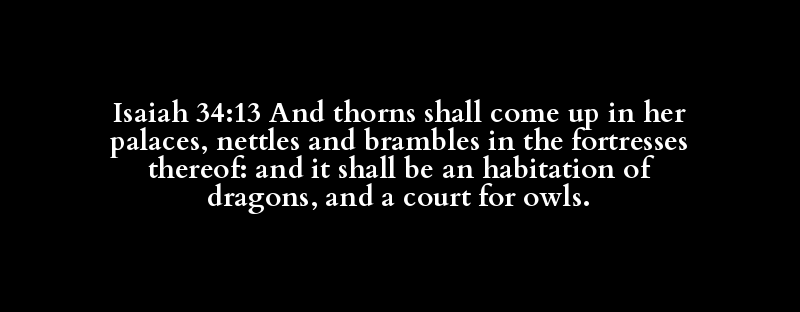 Isaiah 34:13 And thorns shall come up in her palaces, nettles and brambles in the fortresses thereof: and it shall be an habitation of dragons, and a court for owls.