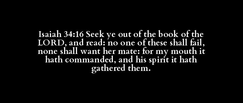 Isaiah 34:16 Seek ye out of the book of the LORD, and read: no one of these shall fail, none shall want her mate: for my mouth it hath commanded, and his spirit it hath gathered them.