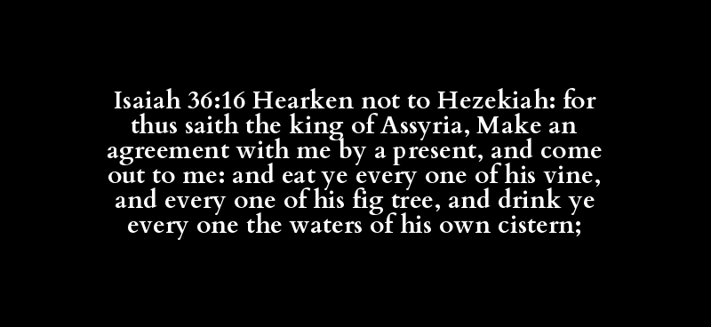 Isaiah 36:16 Hearken not to Hezekiah: for thus saith the king of Assyria, Make an agreement with me by a present, and come out to me: and eat ye every one of his vine, and every one of his fig tree, and drink ye every one the waters of his own cistern;
