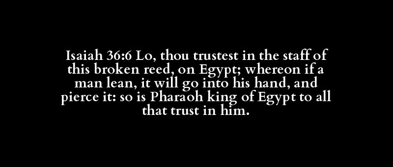 Isaiah 36:6 Lo, thou trustest in the staff of this broken reed, on Egypt; whereon if a man lean, it will go into his hand, and pierce it: so is Pharaoh king of Egypt to all that trust in him.