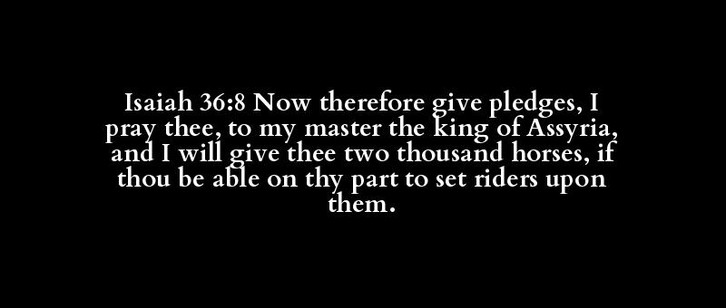 Isaiah 36:8 Now therefore give pledges, I pray thee, to my master the king of Assyria, and I will give thee two thousand horses, if thou be able on thy part to set riders upon them.