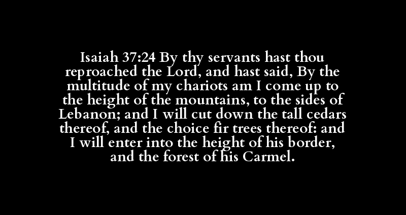 Isaiah 37:24 By thy servants hast thou reproached the Lord, and hast said, By the multitude of my chariots am I come up to the height of the mountains, to the sides of Lebanon; and I will cut down the tall cedars thereof, and the choice fir trees thereof: and I will enter into the height of his border, and the forest of his Carmel.