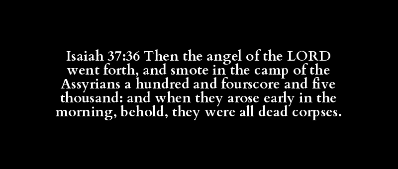 Isaiah 37:36 Then the angel of the LORD went forth, and smote in the camp of the Assyrians a hundred and fourscore and five thousand: and when they arose early in the morning, behold, they were all dead corpses.