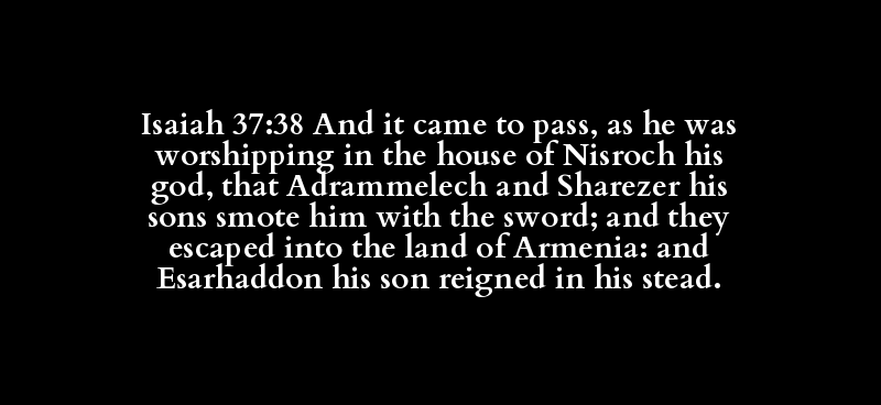 Isaiah 37:38 And it came to pass, as he was worshipping in the house of Nisroch his god, that Adrammelech and Sharezer his sons smote him with the sword; and they escaped into the land of Armenia: and Esarhaddon his son reigned in his stead.