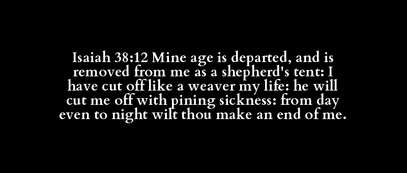 Isaiah 38:12 Mine age is departed, and is removed from me as a shepherd's tent: I have cut off like a weaver my life: he will cut me off with pining sickness: from day even to night wilt thou make an end of me.
