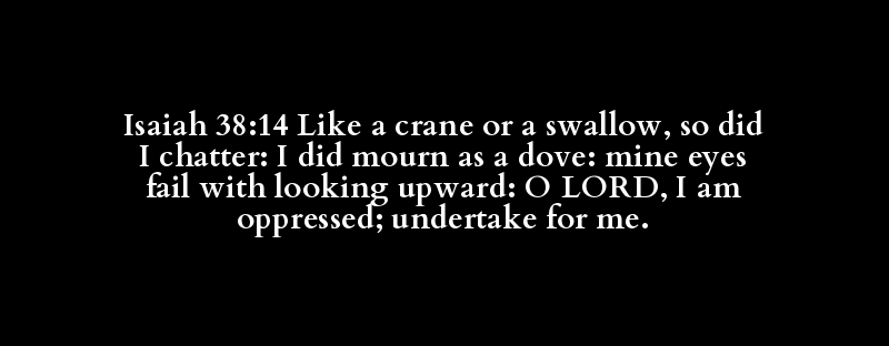Isaiah 38:14 Like a crane or a swallow, so did I chatter: I did mourn as a dove: mine eyes fail with looking upward: O LORD, I am oppressed; undertake for me.