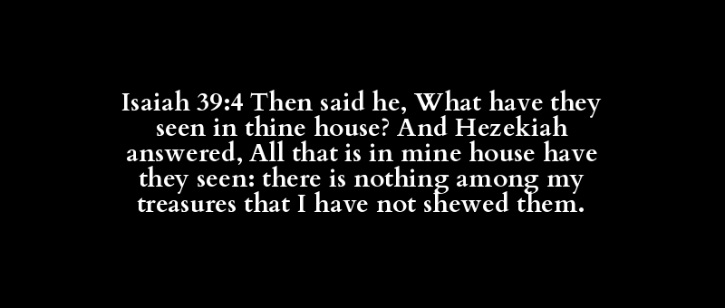 Isaiah 39:4 Then said he, What have they seen in thine house? And Hezekiah answered, All that is in mine house have they seen: there is nothing among my treasures that I have not shewed them.