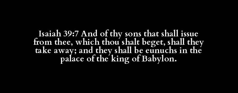 Isaiah 39:7 And of thy sons that shall issue from thee, which thou shalt beget, shall they take away; and they shall be eunuchs in the palace of the king of Babylon.