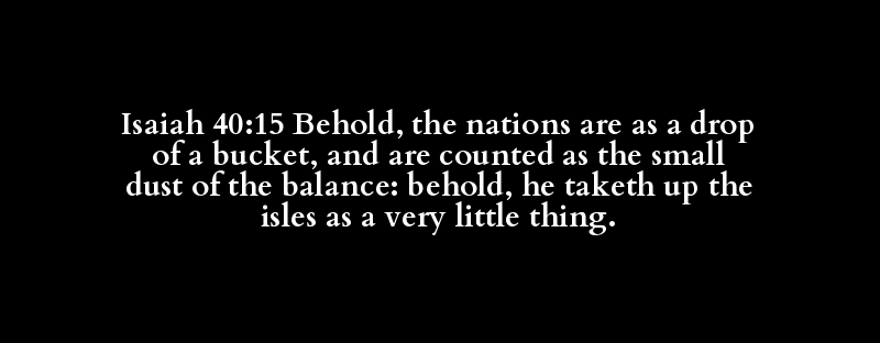 Isaiah 40:15 Behold, the nations are as a drop of a bucket, and are counted as the small dust of the balance: behold, he taketh up the isles as a very little thing.