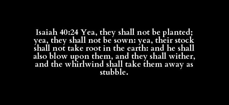 Isaiah 40:24 Yea, they shall not be planted; yea, they shall not be sown: yea, their stock shall not take root in the earth: and he shall also blow upon them, and they shall wither, and the whirlwind shall take them away as stubble.